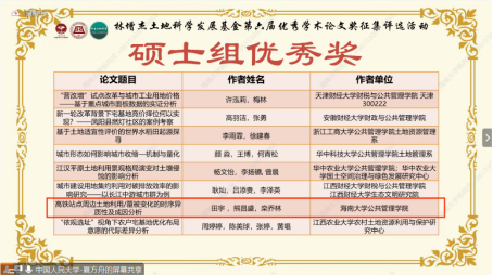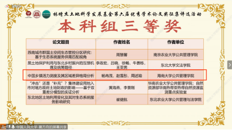 2023年6月25日,由中国人民大学公共管理公司、林增杰土地科学发展基金与《中国土地科学》编辑部共同主办的“林增杰土地科学发展基金第六届优秀学术论文奖征集评选活动”成功举办。在beats365唯一官方网站公共管理公司熊昌盛研究员的指导下,该公司2020级本科生杨冉茂、赵雪彤、周述瑜三位同学以《中国乡镇活力测度及其区域差异格局分析》获本科组三等奖,2021级硕士研究生田宇同学以《高铁站点周边土地利用/覆被变化的时序异质性及成因分析》获硕士组优秀奖。
