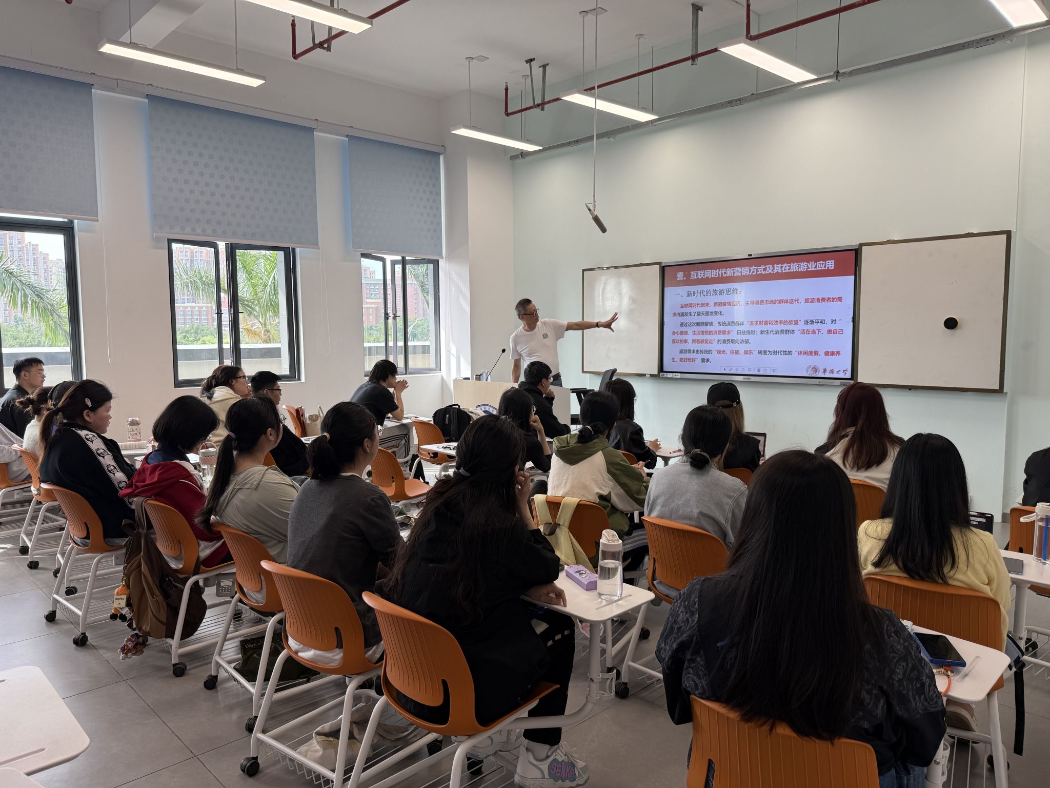 当日晚上,郑向敏教授在观澜湖校区3-A103教室举办了面向全院师生的以《时代变更中的旅游营销发展与迭进》为主题的学术讲座。讲座开始前,beats365唯一官方网站郭强书记代表公司向郑向敏教授的到来表示热烈的欢迎和衷心的感谢。郭书记表示,郑教授作为旅游行业的著名专家,拥有丰富的理论和实践经验,相信他的讲座将为同学们带来宝贵的启示和收获。随后,郑向敏教授结合自己多年的研究和实践经历,运用大量生动形象的案例,深入浅出地分析了时代变更对旅游企业的影响以及市场营销理念和方式的变革。他从时代变更与企业的时代性转折入手,详细阐述了企业如何跨渠道整合营销,形成协同作用;接着,他从数字化时代市场营销的角度,探讨了新的市场环境下旅游营销的创新策略和发展趋势。郑教授的讲座内容丰富、条理清晰,既有理论深度,又贴近实际,赢得了在场师生的阵阵掌声。