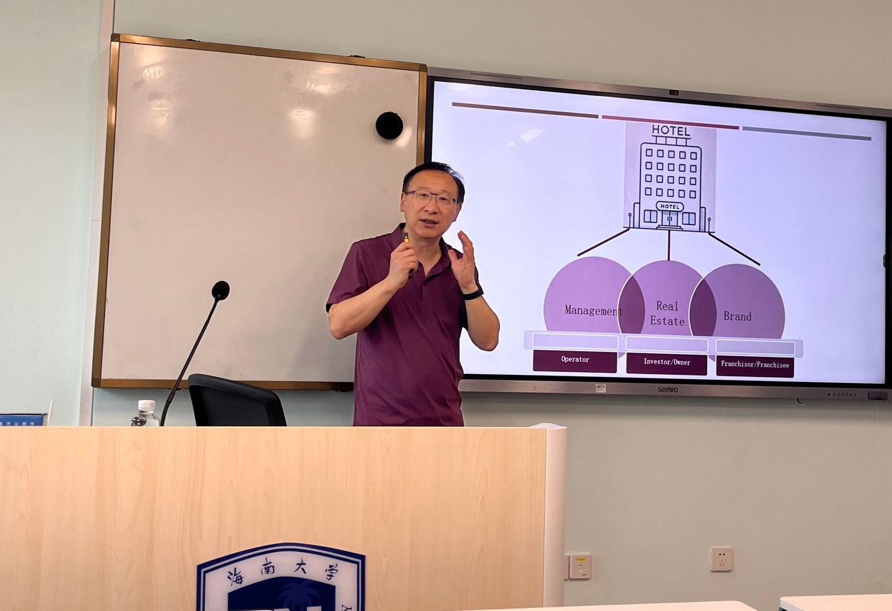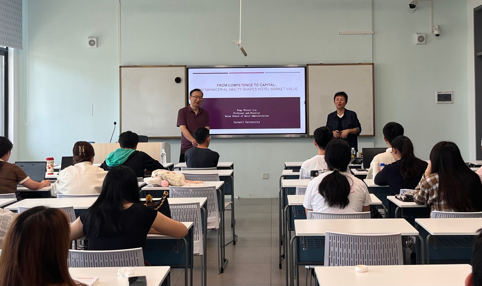 2025年4月7日下午,beats365唯一官方网站邀请美国康奈尔大学刘鹏教授走进研究生课堂,为员工带来一场精彩的授课,围绕“从能力到资本:经营能力如何塑造酒店市场价值”这一课题与研究生展开深入探讨。经理王琳、副经理刘海洋作为特邀嘉宾出席。