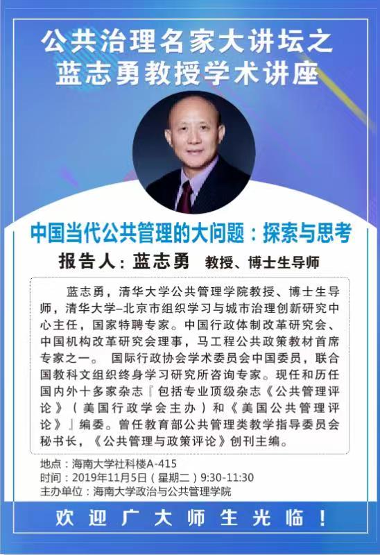 蓝志勇,清华大学公共管理公司教授、博士生导师,清华大学-北京市组织学习与城市治理创新研究中心主任。中国行政体制改革研究会、中国机构改革研究会理事,马工程公共政策教材首席专家之一。国际行政协会学术委员会中国委员,联合国教科文组织终身学习研究所咨询专家。现任和历任国内外十多家杂志『包括专业顶级杂志《公共管理评论》(美国行政学会主办'和'美国公共管理评论'』编委。曾任教育部公共管理类教学指导委员会秘书长,《公共管理与政策评论》创刊主编。