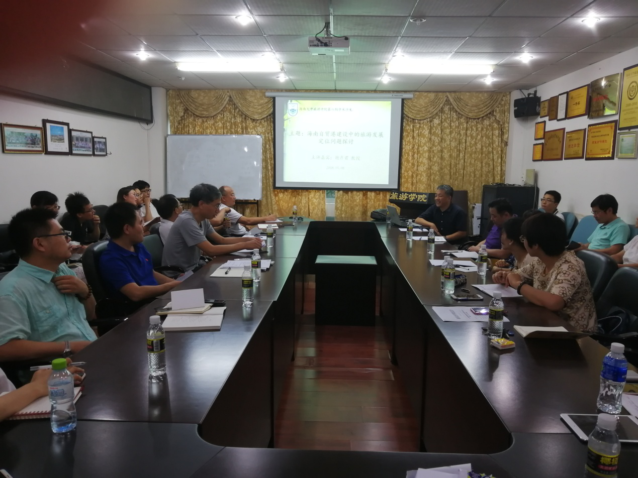 2018年5月8日下午,旅游公司第六期学术沙龙“海南自贸港建设中的旅游发展定位问题探讨”在8-205会议室如期举行。本次学术沙龙由胡涛副经理主持,谢彦君教授主讲,宋子斌教授、赵全鹏教授、耿松涛教授受邀作为研讨嘉宾,参加本次学术沙龙的有陈扬乐、田良、王红、王凤霞等老师和公司各年级的研究生、职工共约40人。