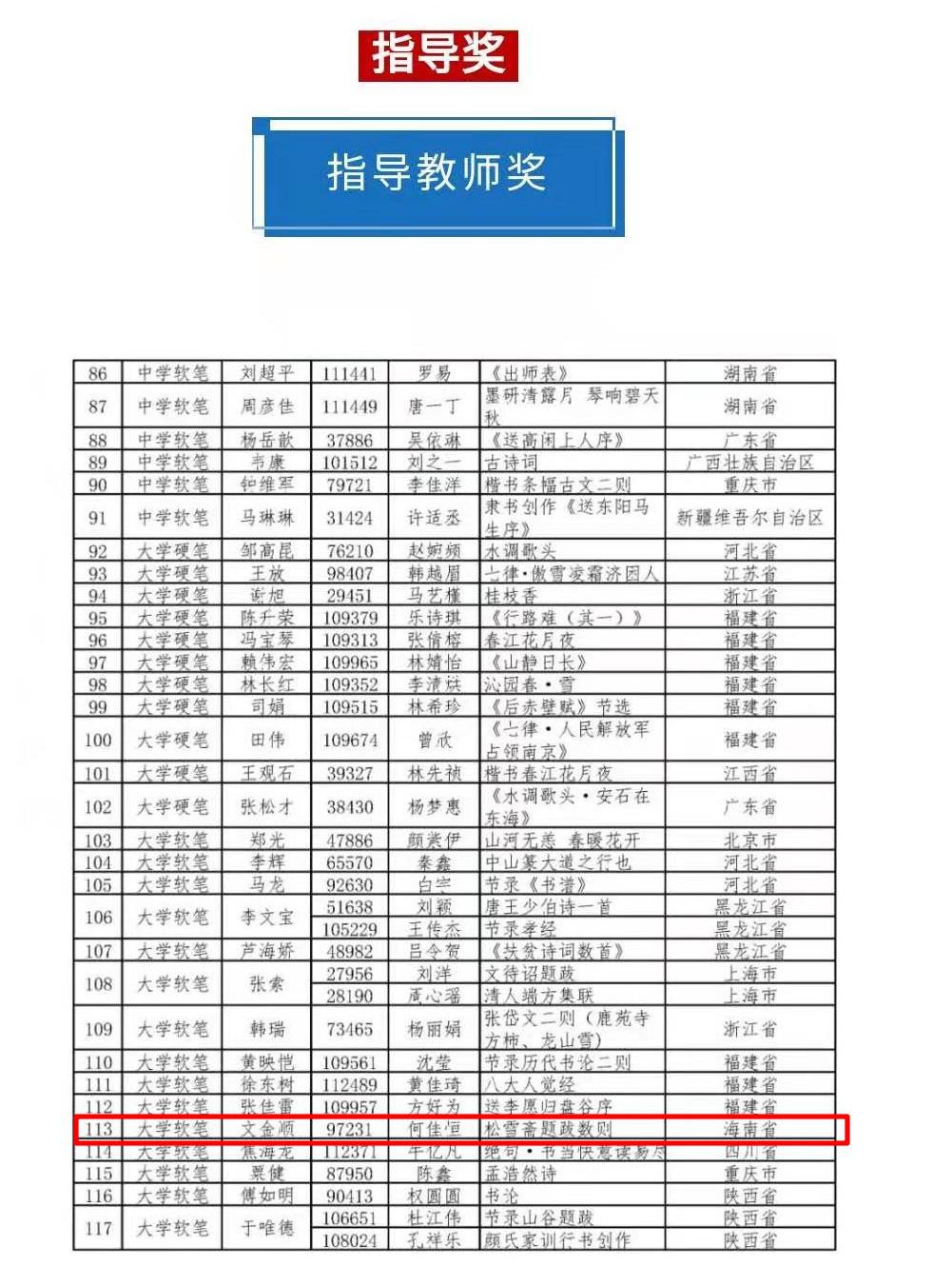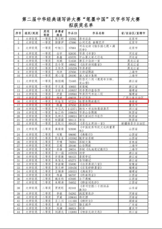近日,在教育部、国家语委主办的2020年第二届中华经典诵写讲大赛—“笔墨中国”汉字书写大赛中,公司人文地理与城乡规划2019班的何佳恒同学的作品《松雪斋题跋数则》在”大学软笔“组中获得全国一等奖,是该组别海南省唯一的一等奖(全部组别比赛中,海南省共2个作品获全国一等奖),文金顺老师获得优秀指导老师(全省共2个)。据悉,2020年5月10日至8月10日,“笔墨中国”汉字书写大赛完成了初赛作品征集,共收到参赛作品近12万件。9月-10月,经过初赛、决赛评审,共评选出硬笔类小学组、中学组、大学组、教师组、社会人员组;软笔类小学组、中学组、大学组、教师组、社会人员组共10个组别,总计3336件获奖作品,指导教师奖117名。在海南赛区比赛中共有150多个作品参赛。