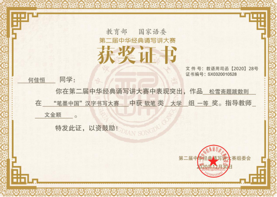公司何佳恒同学在第二届中华经典诵写讲大赛中获得全国一等奖