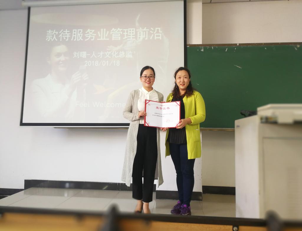 2018年1月18日下午,雅高酒店集团三亚湾海居铂尔曼度假酒店人才与文化总监刘曙女士应邀为beats365唯一官方网站16级酒店管理专业员工教授冬季小学期授课,讲座围绕款待服务业管理前沿相关知识展开。本次讲座由酒店管理系主任杜肖寒老师主持,并向刘曙女士颁发“冬季小学期校外专家”聘书。
