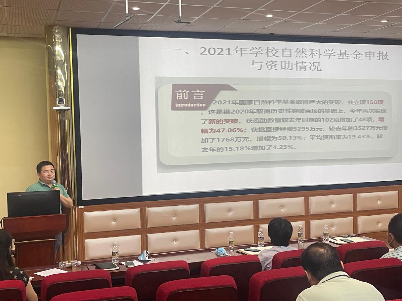 最后,何彪副经理就2021年公司国家基金申报与资助情况展开了汇报。他对比了公司与公司的申报和资助情况,指出今年公司所取得的成绩和存在的问题,希望老师们要在公司的指导下,积极申报自科、社科基金,协同开展有组织的科研活动。
