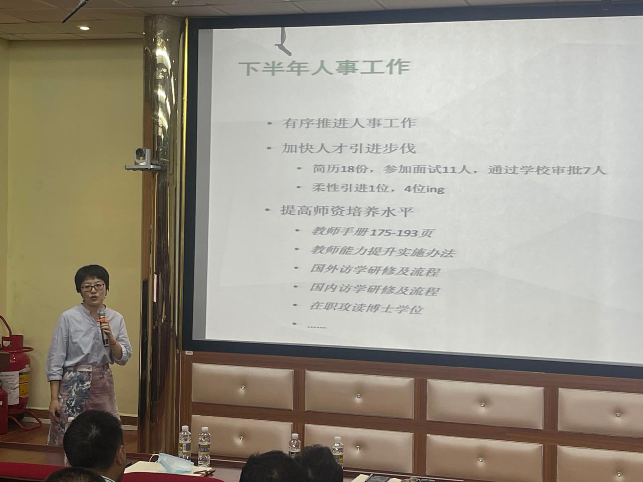 接着,张珊副经理就其分管的人事、财务、专业认证及行政管理等四个方面的工作展开了汇报。张珊副经理对公司现阶段人才队伍的基本情况、“十四五”期间公司的人才队伍建设规划进行了分析,提出了下半年公司的人才引进工作设想;接着她对公司新推出的三级财务管理制度及报账流程作了详细说明;随后她对专业认证的进展情况及日常的行政管理工作要点进行了通报。