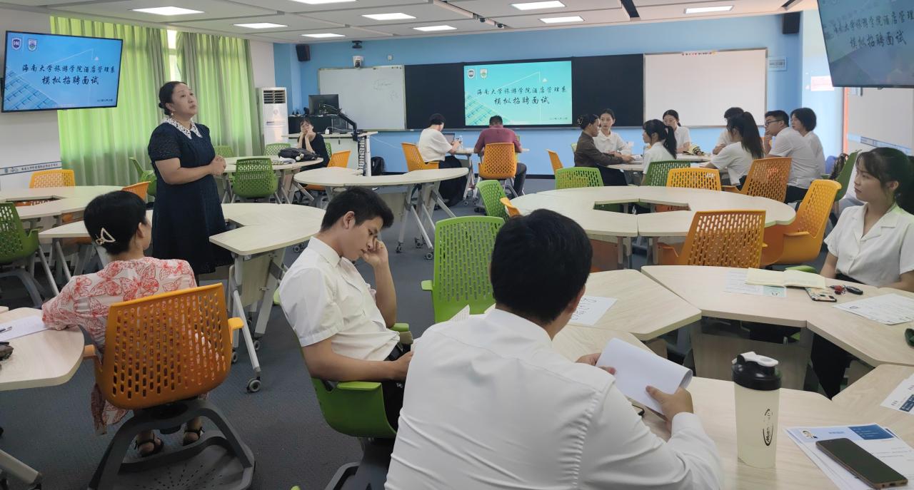 分享结束后,模拟面试按照简历投递、英文自我介绍、专业知识问答等环节井然有序地开展,每一位同学都以饱满的姿态参加本次面试,他们展现了海大酒管人的精神面貌。经过两个小时紧张的面试,所有同学都得到了属于自己的一份答卷。