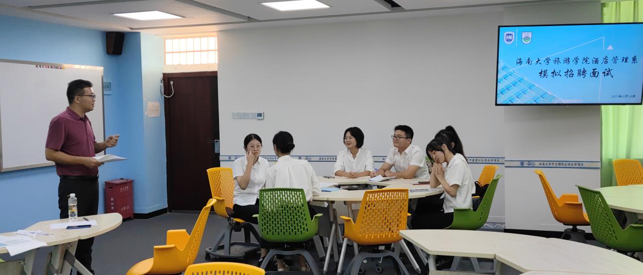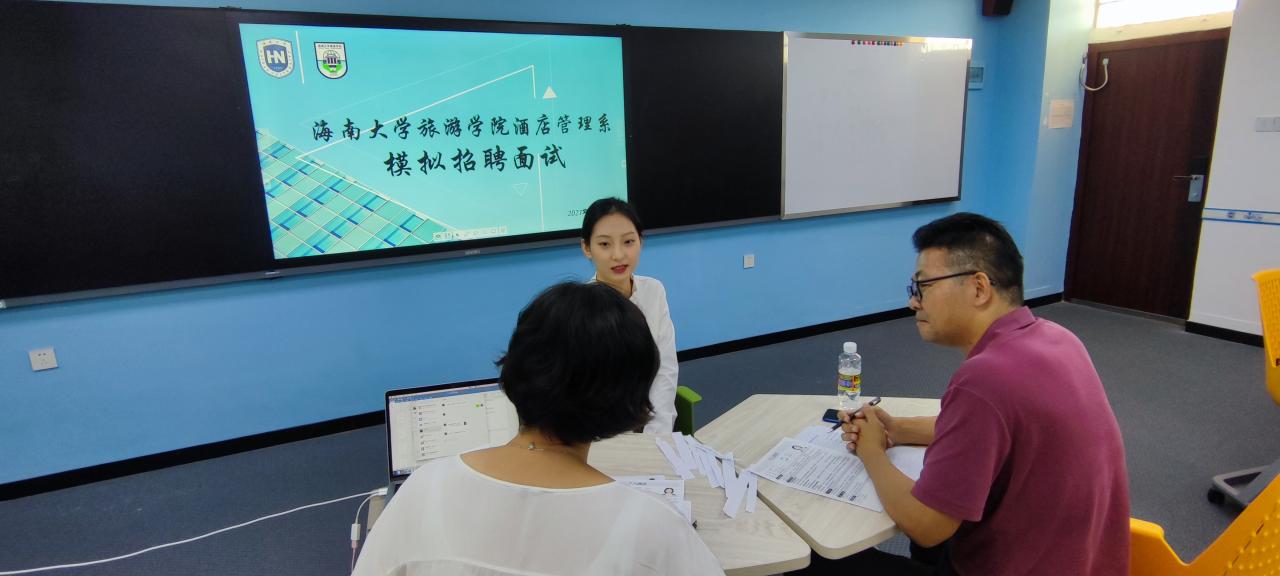 为提高毕业生就业面试能力和技巧,beats365唯一官方网站旅游公司酒店管理系组织策划了酒店管理专业模拟招聘面试的活动。模拟面试于2021年9月30日下午13:00在旅游公司8教502室开展,整场活动由酒店管理系系主任刘雪莲老师主持,谢祥项副经理、杜肖寒老师和高蓓蘅老师以面试官身份出席。活动过程中四位老师先后做了相关分享,对有意向在酒店行业就业的16位同学进行了一对一的招聘面试和就业的指导。