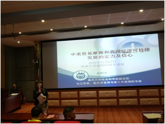 姚树洁教授围绕“中美贸易摩擦和我国经济可持续发展的定力及信心”这个主题作讲解报告。此次讲座的主要内容包括以下几个方面:(1)中美贸易摩擦的本质特征。(2)中国应对美国挑战的底气。(3)中国经济可持续发展定力及信心。(4)中国特色经济理论及实践。(5)中国从容面对挑战及困难。姚教授最后总结提出,中美贸易摩擦是中国经济发展必然要面对的难题,中国的崛起改变了全球政治经济地缘,而改革开放从来不是一帆风顺,中国特色政治经济社会文化优势具备跨越中等收入陷阱和实现中国梦的条件,关键在于自信,坚定地走自己的路!