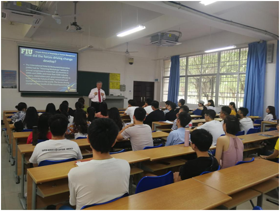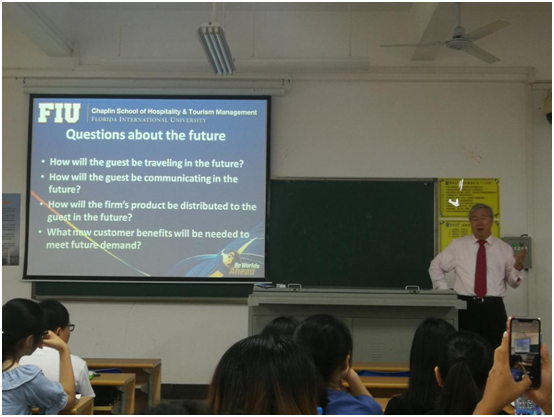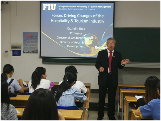5月27日至6月5日期间,beats365唯一官方网站旅游公司2017级酒店管理专业两个班104位同学迎来了美国弗罗里达国际大学旅游与酒店管理公司终身教授赵金林博士的全英文授课。赵金林教授以酒店业战略发展和创新管理为主题,设计了Forces driving change、Competitive methods、Franchise and management contract、An environmentally sensitive approach等四个讲授主题和一次小组作业考核(Group presentation),两个班的小组作业重点考核了同学们用驱动力模型、环境分析模型等对酒店集团进行了分析并进行了PPT全英文分享,最后,赵教授对各小组的研究成果进行了点评。