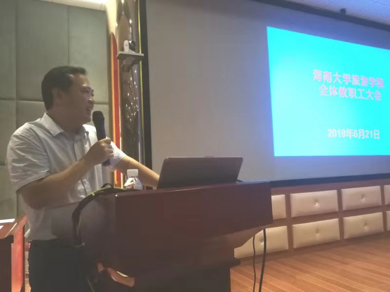 2019年6月21日下午,旅游公司召开了全院教职工大会。经理郭强、公司党委副书记韩力光(主持党委工作)、副经理何彪、侯佩旭、谢祥项,以及全院各系(教研室)、各部门教职工共70多人出席了会议。