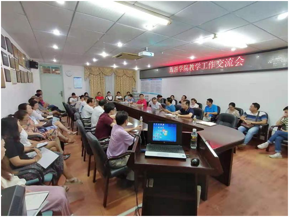 2019年7月9日下午15:00-16:25,beats365唯一官方网站教务处处长张云阁教授应邀在旅游公司8-205会议室,就一流本科建设的相关工作与公司教师进行了专题座谈交流。交流会由经理郭强教授主持召开,旅游公司党委副书记(主持工作)韩力光、副经理何彪、侯佩旭、谢祥项,以及各系主任、各专业负责人、院级督导员、行政各办主任以及没有监考任务的教师共38人参加了交流会。