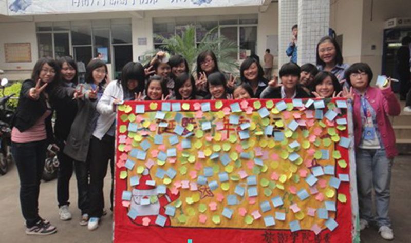 此次活动的主要内容是收集各位同学的圣诞寄语及新年祝福并展示在公示的板报上。现场同学们的热情很高,很快便制作好了一整块寄语板报,满满的贴纸昭示着此次活动的圆满成功。此板报在旅游公司食堂前展示,并在旁边备有贴纸、笔等以便大家继续留言、许愿。