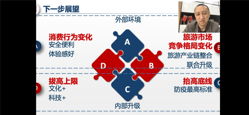 讲座后期,郭强经理对酒店业下一步进行了展望,提出了酒店业必须面对消费者行为变化和旅游市场竞争格局变化的两大外部环境变化,必须通过“拔高上限”(文化+和科技+)和“抬高底线”(疫情防控底线和健康安全底线)来系统 强化内部升级,实现海南酒店业高质量发展和可持续发展,为海南国际旅游消费中心建设奠定坚实基础。