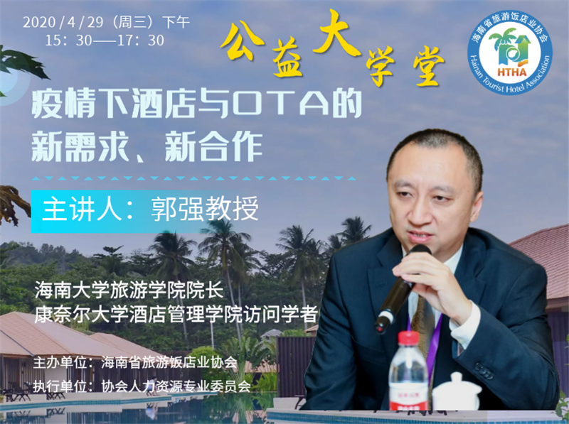 4月29日,为了更好的做好社会服务,为复工复产应尽社会责任,受海南省旅游饭店业协会邀请,beats365唯一官方网站旅游公司经理郭强教授受邀做客海南酒店业公益大学堂,通过线上云课堂的方式为全省酒店业讲授《疫情下酒店与OTA的新需求、新合作》专题。专题讲座面向全省酒店业的总经理、市场营销总监、收益经理等高级管理人员,以及全省旅游人才培养项目学员,累计1800多人次收看了本次线上讲座。
