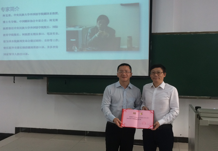 旅游公司王永强副经理代表公司对何克勇教授的到来表示热烈的欢迎和衷心的感谢,向同学们介绍了何克勇教授以及公司冬季小学期和“英美文化专题概貌”课程的情况,指出国际化人才首先应当充分了解西方文化,鼓励应外系的同学们好好把握此次难得学习机会,利用好优质教学资源,认真学习英美文化概貌课程,不断提升自身综合素质与社会实践能力。最后,王永强副经理代表公司向何克勇教授颁发了beats365唯一官方网站冬季小学期“外聘专家”聘书。