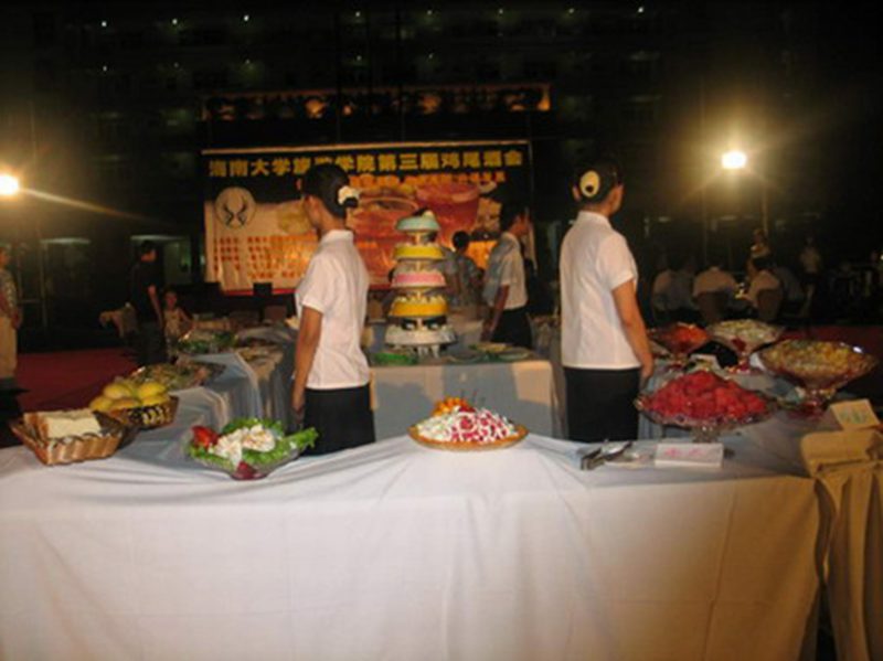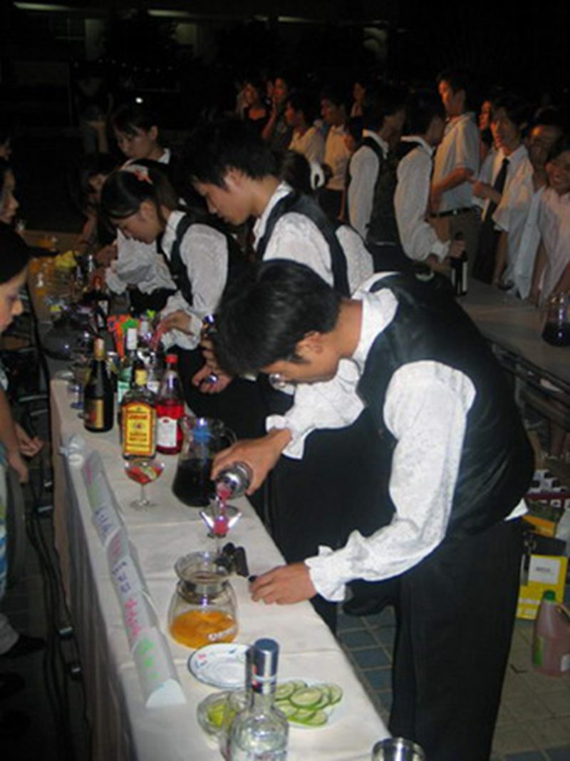 本届鸡尾酒会是由旅游公司学工办主办、2003级宾馆管理专业承办的。从鸡尾酒会前期的宣传策划到鸡尾酒会现场的鸡尾酒调制,茶艺表演,水果沙拉、水果拼盘、西点、甜点的制作以及酒会现场的所有服务工作均由2003级宾馆管理专业的员工共同完成。该专业员工通过一个多月的精心准备,结合两年来系统学习的酒水与酒吧管理、餐饮管理、烹调原理、特色餐饮服务等专业知识,通过本届酒会向现场的企业人士、领导嘉宾、社会各界人士、同学展示了他们的热情服务、专业技能知识、实践创新能力。