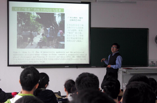 在讲座中,朱竑教授以自己的学术生涯为线索,简述了国内新文化地理学的发展历程,鼓励同学们不怕挫折,善于在困难中磨练自己。朱教授通过人文地理学八大国际核心期刊的文献统计分析,详细剖析了国外人文地理学的最新研究动态,指出研读英文文献与国际学术前沿接轨,并吸收其精华应用到国内实际问题的研究中,对于员工养成良好学习习惯和思维方式至关重要。朱教授以自己和员工、同事的研究论文为例,生动细致地展示了如何在日常生活、社会时事和研究文献中发现话题,逐渐深化和提升为研究课题和成果的过程。朱教授的讲座全面介绍了国内外情感地理学、自然的社会建构等新文化地理学的最新动态,极大地开阔了大家的学术眼界,其“见微知著”、“小题大做”、“边境地区的民族认同”、“全球化背景下的本土化研究”等学术主张,在日常生活和田野调查中发现研究话题,梳理提升学术成果的科学思想和方法,使在座同学深受启发教益。大家被朱教授内容丰富而新颖的精彩演讲深深吸引,以至于常常忘了下课。