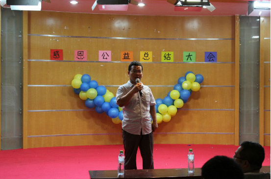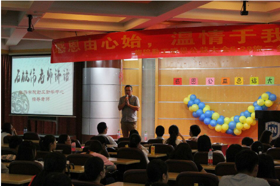 大会很快进入尾声,优秀个人代表孟斐发表了个人感言,随后是激动人心的颁奖仪式,在激昂的颁奖音乐声中,活动优秀志愿者和优秀个人上台领取获奖证书并合影留念。最后,旅游公司勤工助学中心指导老师石雄伟对活动进行总结,指出同学们在接受社会帮助时应以一份感恩的心回馈社会,用自己的行动证明自己心存感激,积极参与公益活动,努力为社会尽一份责任,坚持诚信、励志和感恩。