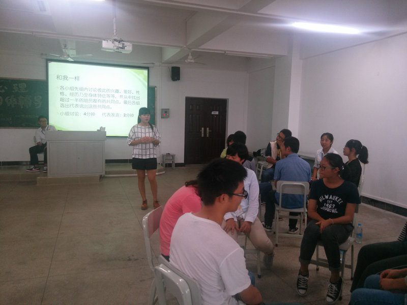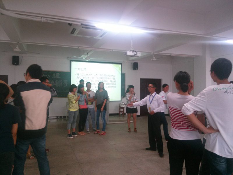 此次辅导培训分为三个环节:热身环节、活动环节、尾声。在辅导培训正式开始前,邹靖老师先给同学们做了一些关于心理团体辅导的介绍,包括:团体辅导的目标、团体辅导的动力、团体辅导的专业道德、团体辅导的原则等。在基本介绍结束之后,培训正式开始。在热身环节中,邹靖老师组织在场全体同学玩了“一元五角”的小游戏,同学们由一开始的陌生拘谨慢慢放开自己、全力投入,在笑声中大家拉近了彼此间的距离,全场氛围轻松活跃。在小游戏后,邹靖老师问了一些同学的感受,同学们都发出了“要勇敢地走出自己的圈子,要融入集体,投入其中”的感想,之后,邹靖老师做了点评,她说道:“这个游戏告诉大家的,不光是让大家敞开心扉、积极投入,还告诉大家每个人都是被需要的,每个人都有自己的价值,我们要善于去发现每个人身上的闪光点。”同学们认真聆听,若有所思。之后的活动环节中,包含了“和我一样”“你演我猜”“自我肯定”“头脑风暴”这四个小活动。四个活动层层递进深入,由同学们一开始彼此建立信任,到达成默契,到得到他人的肯定,再到了解彼此的困扰并帮助对方解开心结,通过实际案例体验了做心理辅导员的感受,并正视目前所遇到的问题,自我探索、重获信心。组员们配合默契,表现精彩,通过轻松愉快的小游戏、组内交流、代表分享展示,将全场氛围推向了一个高潮。最后尾声环节的大合唱,全体同学起立高声合唱《相亲相爱》,增强了大家的集体意识,奠定了整个团体心理辅导的氛围。最后,邹靖老师说:“希望通过这次心理团体辅导,大家可以更加了解自己完善自己进而可以去帮助别人,达到真正的共同成长。”