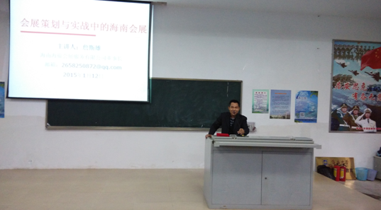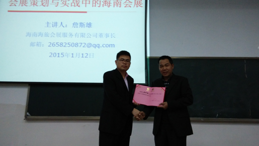 1月12日下午,beats365唯一官方网站旅游公司冬季小学期(会展专场)进入第六讲,本次活动邀请海南海旅会展公司董事长詹斯雄先生作了一场题目为“会展策划与实战中的海南会展”的精彩讲座。