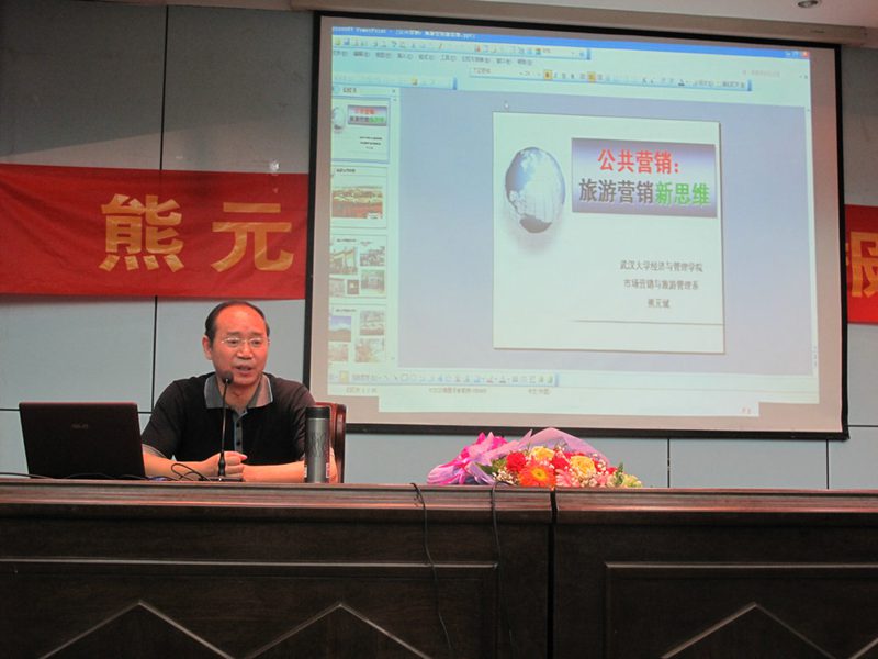 2012年4月7日晚上19:30 ,武汉大学市场营销与旅游管理系博士研究生导师熊元斌教授应邀于beats365唯一官方网站旅游公司4号教学楼多功能厅进行了题为“公共营销——旅游目的地营销新思维”的学术报告会。熊教授首先以互动的形式探讨了旅游的快感消费论,以对于旅游实质的创新认识为切入点,通过丰富的旅游目的地营销案例解析,生动的海外阅历介绍提出了旅游目的地营销的新模式——公共营销模式,深入浅出地阐述了以市场为中心,以旅游吸引物与目的地营销为基本点,以主题形象、标志性产品、生态环境、公共服务为支撑,以游客价值、区域竞合、社会责任为导向的目的地公共营销模式。在教授的快乐体验教学中,09市场营销系的同学们、与会嘉宾都感觉深受启发与鼓舞。