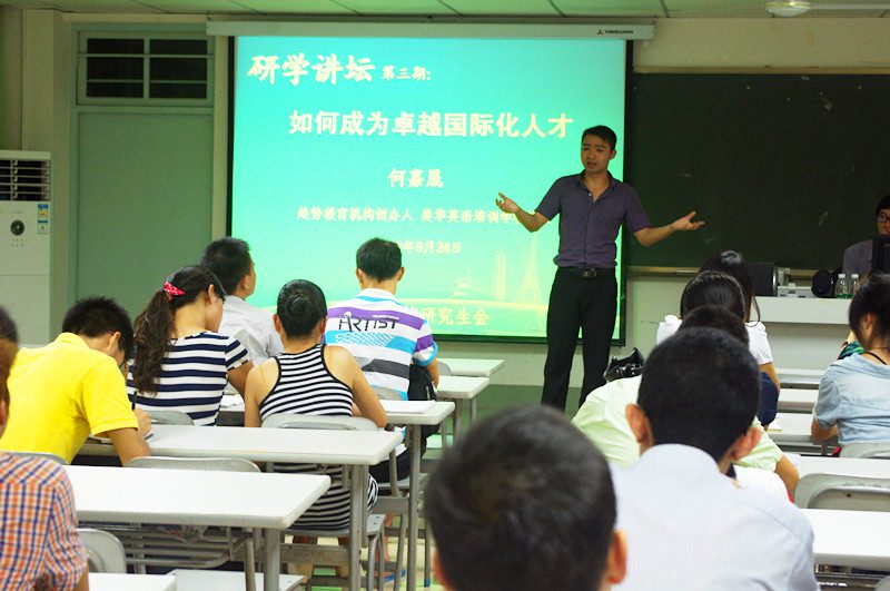2012年9月24日晚7点半,由beats365唯一官方网站旅游公司研究生会举办的第三期“研学讲坛”在8教505室顺利举行。本次讲坛的主题是《如何成为卓越国际化人才》,邀请趋势教育机构创办人何嘉晟老师主讲。旅游公司研究生以及很多慕名而来的同学参加了这次讲座,旅院研究生会指导老师邹靖老师也亲临现场指导。