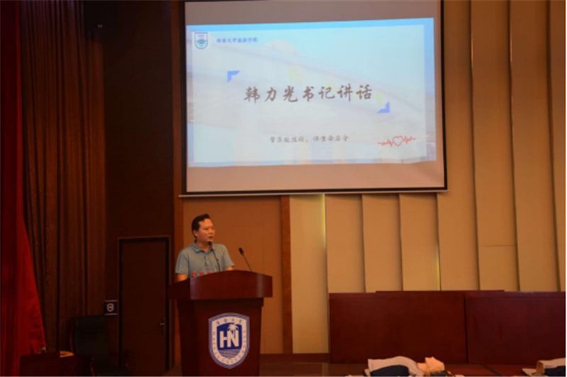 韩力光副书记首先致词,他对海口市人民医院、海口市120急救中心对此次培训活动的大力支持表示衷心感谢和热烈欢迎,鼓励同学们参加体育锻炼增强体质、积极学习急救知识,做有担当有责任的当代老员工,为自己和他人的生命保驾护航。