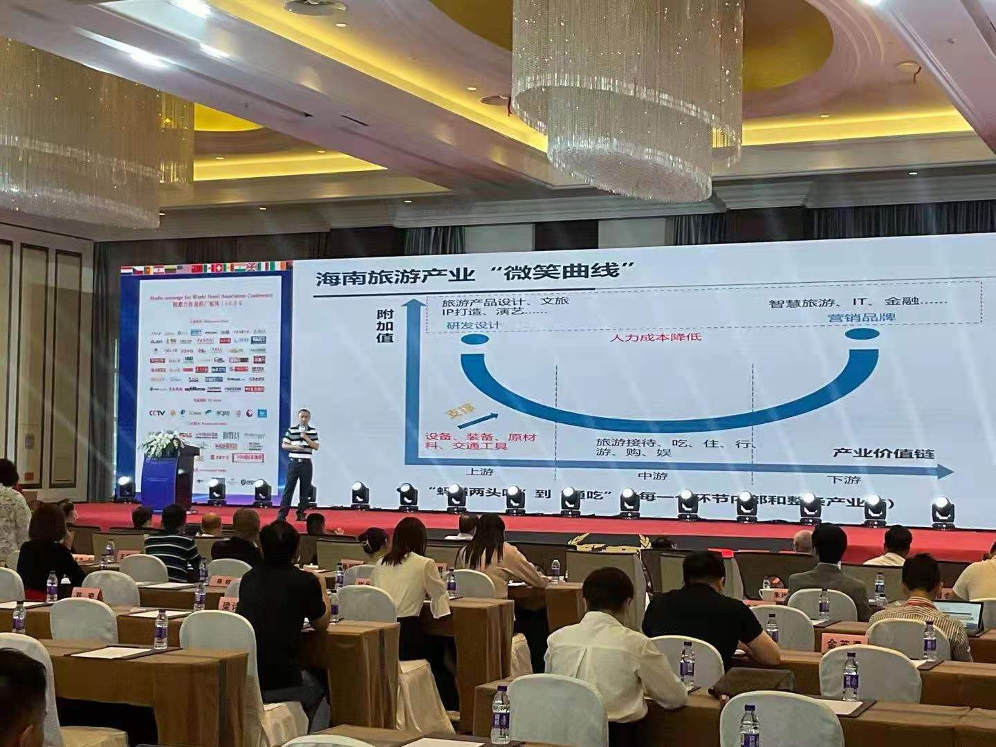 郭强经理作为受邀嘉宾,发表了《海南自由贸易港政策制度体系对旅游业发展的机遇》的主题演讲,以海南自由贸易港政策制度体系下自贸港的高质量发展为切入点,从高质量发展要素、旅游产业链延长、旅游新产品新业态等维度深度探讨了海南旅游业当下的发展机遇并表达了对未来的展望。郭强经理形象地通过制造业“微笑曲线”作类比,指出海南旅游业应当发挥其核作心经济地位价值和引领作用,通过产业集聚效应、供给需求双高端等实现低附加值到高附加值的转变。