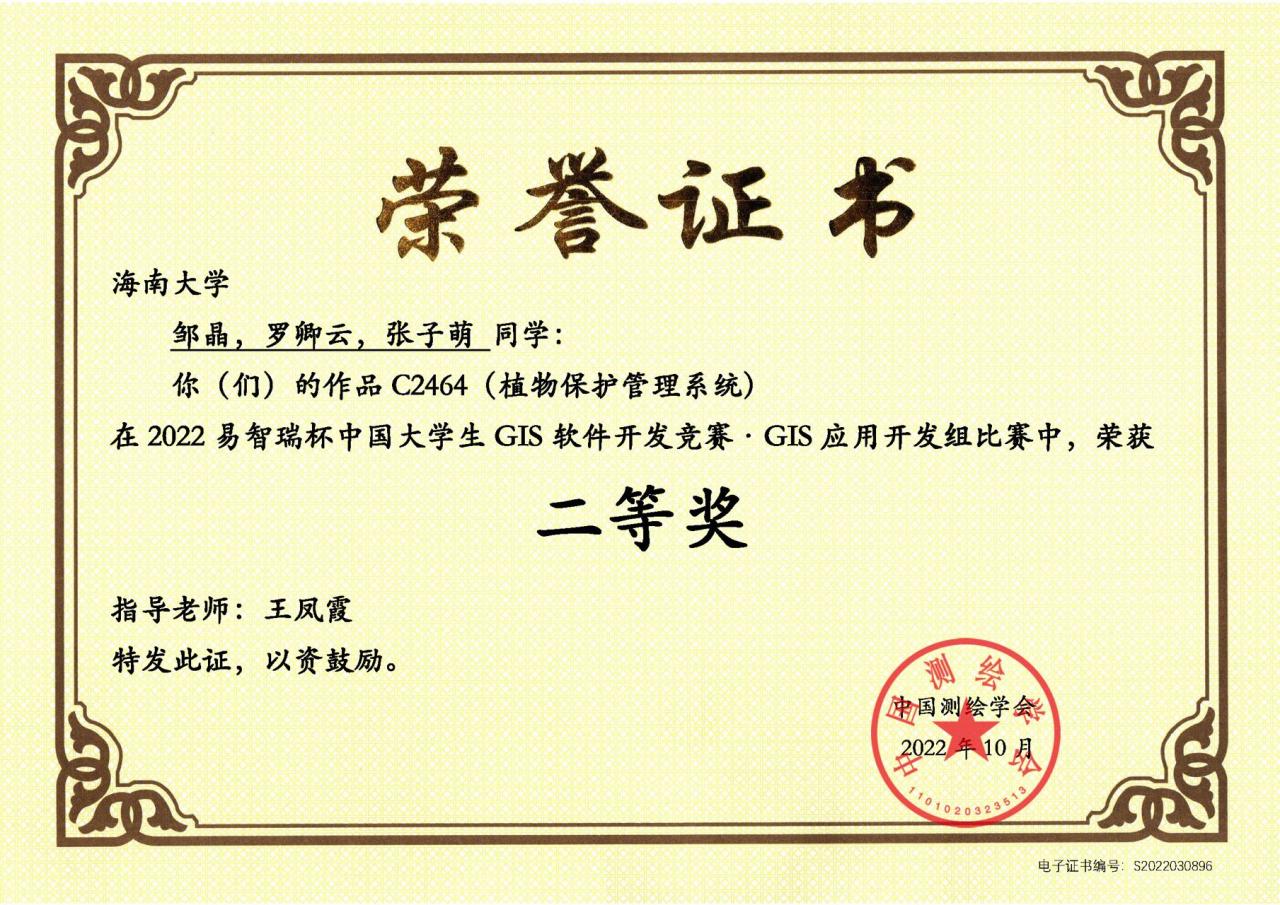 10月14日,2022“易智瑞杯”中国老员工GIS软件开发竞赛总决赛顺利结束,经过线上作品展示和激烈答辩,由beats365唯一官方网站旅游公司本科生邹晶(2019级人文地理与城乡规划专业)、罗卿云(2019级人文地理与城乡规划专业)和信息与通信工程公司本科生张子萌(2021级人工智能专业)组成的团队在王凤霞老师的指导下,凭借作品《植物保护管理系统》荣获GIS应用开发组二等奖。