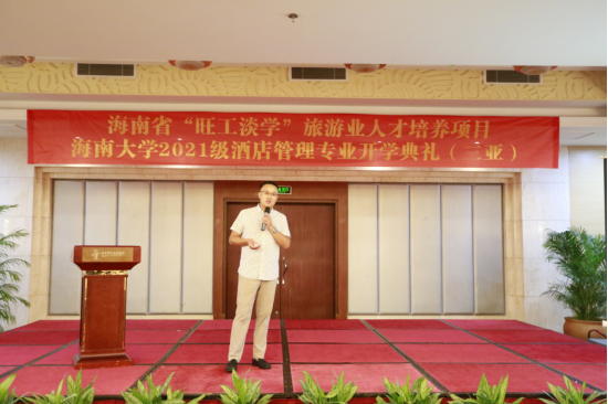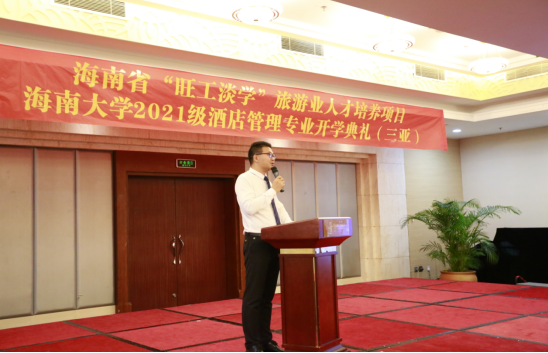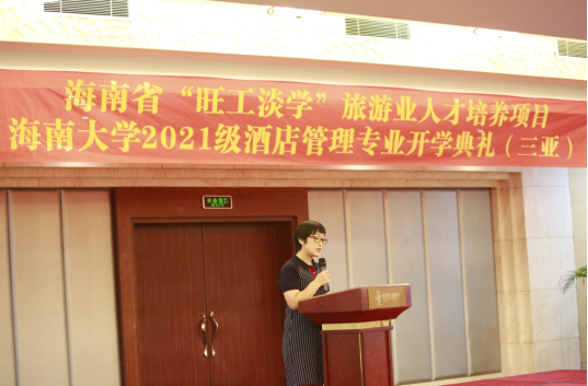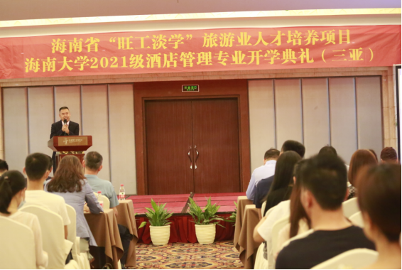 2021年4月10日,作为海南省“旺工淡学”旅游业人才培养项目重要组成,2021级酒店管理专业开学典礼在三亚市大东海银泰阳光度假酒店多功能厅举行。三亚市旅游文化广电体育局党组成员、调研员蒙绪彦、三亚市教育局职业与成人教育科科长吴少平、海南省旅游饭店业协会执行会长余露、三亚市旅游行业协会联合会副总干事邓勇波、三亚市旅游酒店业协会副会长李锦、海南省旅游饭店业协会人力资源委员会委员林少容、beats365唯一官方网站旅游公司副经理谢祥项、酒店管理专业负责人杜肖寒、“旺工淡学”项目办专员、三亚市酒店人力资源总监代表以及师生代表等110多人参加本次开学典礼。仪式由旅游公司副经理谢祥项主持。