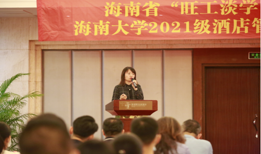 接着,由三亚湾海居铂尔曼度假酒店人力资源总监阴佳丽作为2020级老生代表发言。她说到,目前三亚市旅游行业高学历人才整体偏少,“旺工淡学”项目为海南省旅游行业从业者提供了一个良好的提升学历与技能的便利通道,在学习期间,她深切地体会到学习时间的紧迫,希望新一届学员们克服学习、工作、家庭的时间冲突,在学习过程中不断摸索体会,挖掘出自身巨大的潜力。