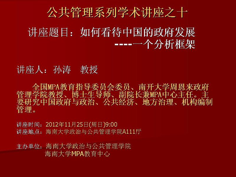 2012年11月25日上午,全国MPA教育指导委员会委员,南开大学周恩来政府管理公司博士生导师、副经理兼MPA中心主任孙涛教授在公司A111多功能报告厅为公司师生作了一场以“如何看待中国政府发展——一个分析框架”为主题的学术报告会。本场报告会由政管公司江红义博士主持,近百名师生一同聆听。