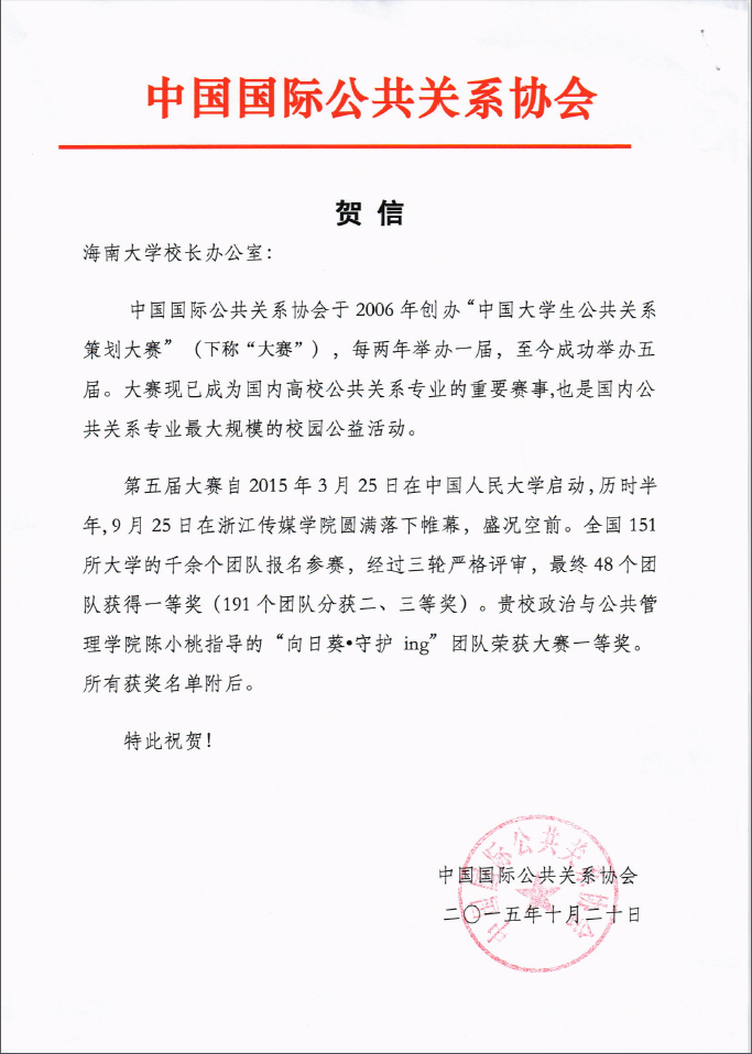 “中国老员工公共关系策划大赛”创办于2006年,每两年举办一届。第五届大赛自今年5月份在中国人民大学启动后历时半年在浙江传媒公司萍帷幕。公司团队“向日葵·守护ing”在陈小桃教授指导下荣获一等奖,中国国际公共关系协会发来贺信表达祝贺。