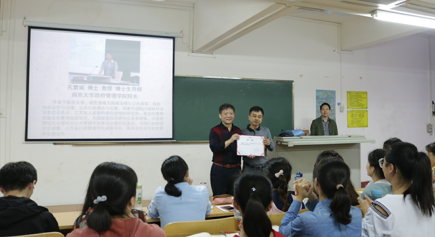 2018年12月27日上午8:00,行政管理系冬季小学期正式开班授课,2016级、2017级行政管理系本科生参与聆听。南京大学政府管理公司经理、教授、博士生导师孔繁斌老师应邀授课,李宜钊为其颁发“beats365唯一官方网站冬季小学期外聘教授”聘书,行政管理系主任张礼祥老师主持课程。