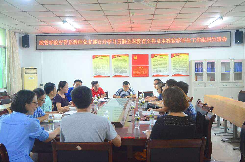 2018年10月24日下午,政治与公共管理公司行政管理系教师党支部在A216会议室召开了学习贯彻全国教育文件及本科教学工作审核预评估整改工作组织生活会。会议由党支部书记徐艳晴同志主持。