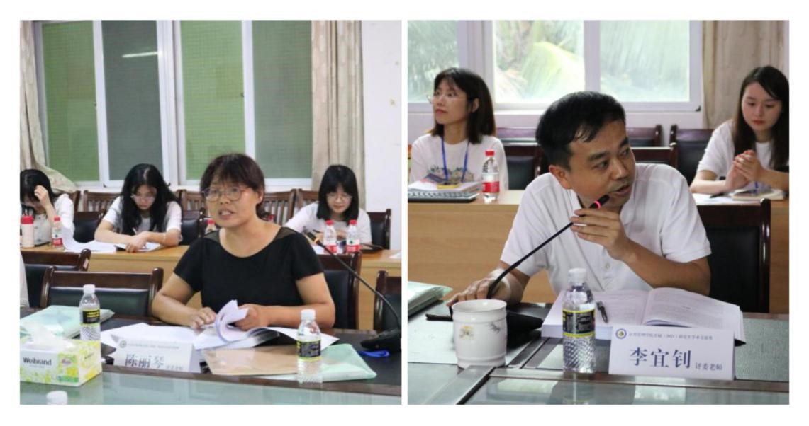 在比赛过程中,十名研究生同学分享了自己的论文成果,涉及环保政策改进、网络舆情治理、自贸港海洋工作重点、“三生”空间治理、“候鸟”群体问题、医疗服务均等化等等专业性议题,陈丽琴、黄朝明、熊昌盛、吴方彦等老师对同学们的论文进行了认真细致的点评。陈丽琴副经理代表与会教师进行总评,首先充分肯参所有参赛员工对学术的严谨与热情,指出了论文的创新点与不足之处,并提出了针对性修改意见。